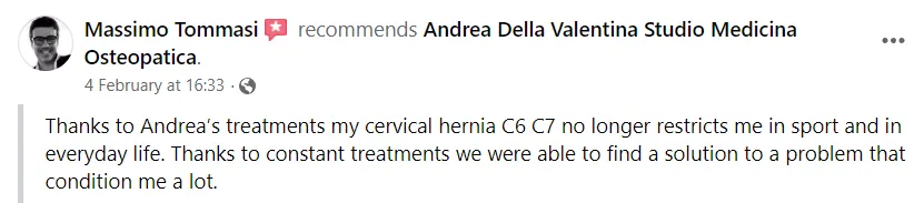 "La mia ernia cervicale C6 C7 non mi limita più nello sport e nella vita quotidiana. Grazie a trattamenti costanti siamo riusciti a trovare una soluzione."