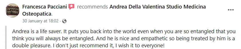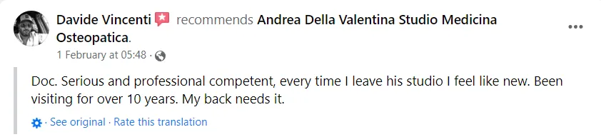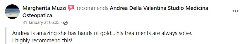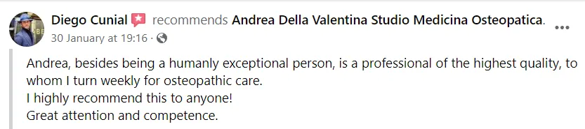"Un professionista di altissima caratura, a cui mi rivolgo settimanalmente per le cure osteopatiche."